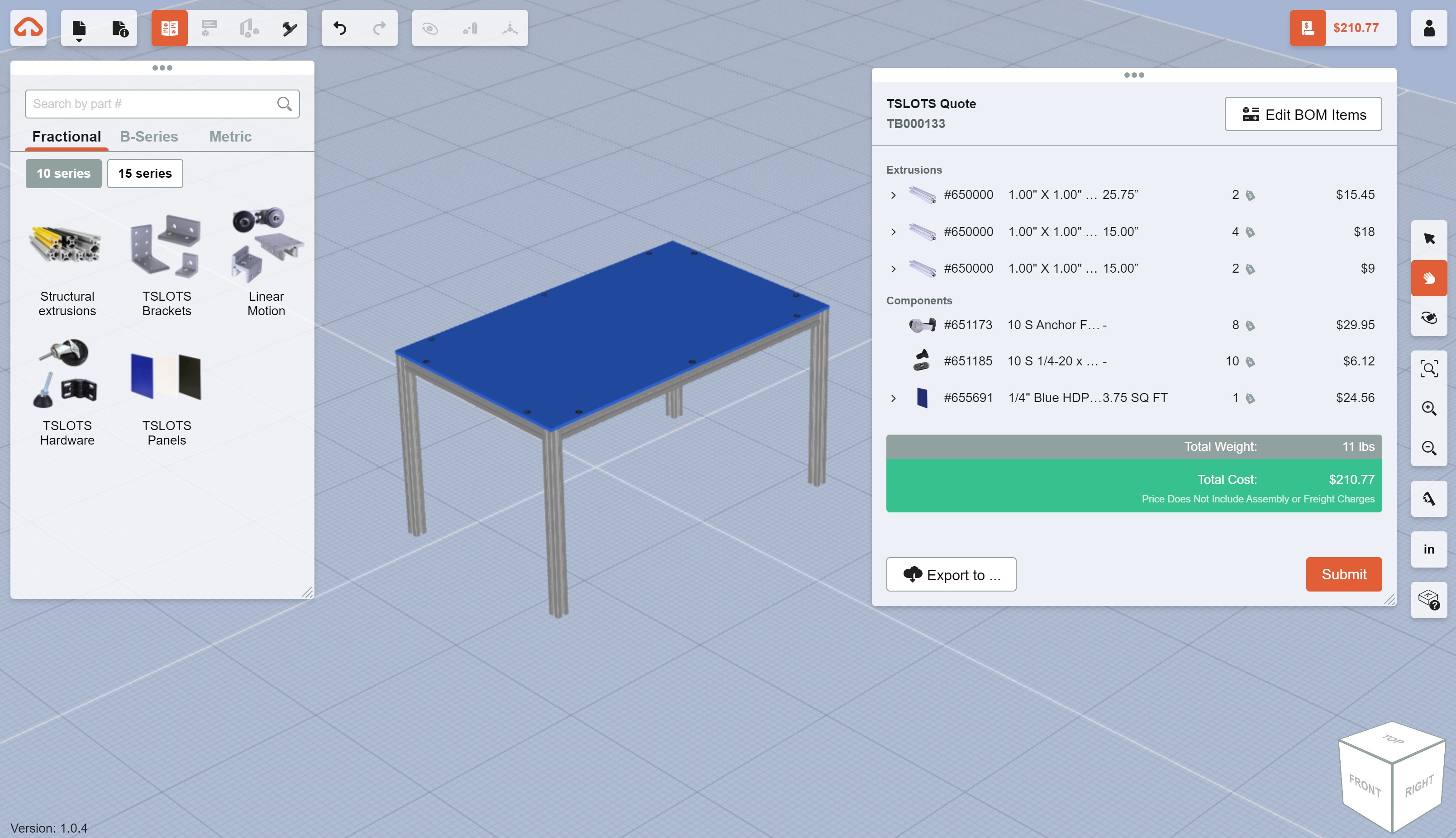 TSLOTS' design software is an intuitive, easy-to-use, web-based tool that allows you to seamlessly create and edit designs, print a bill of materials, and obtain real-time pricing for your aluminum extrusion project.